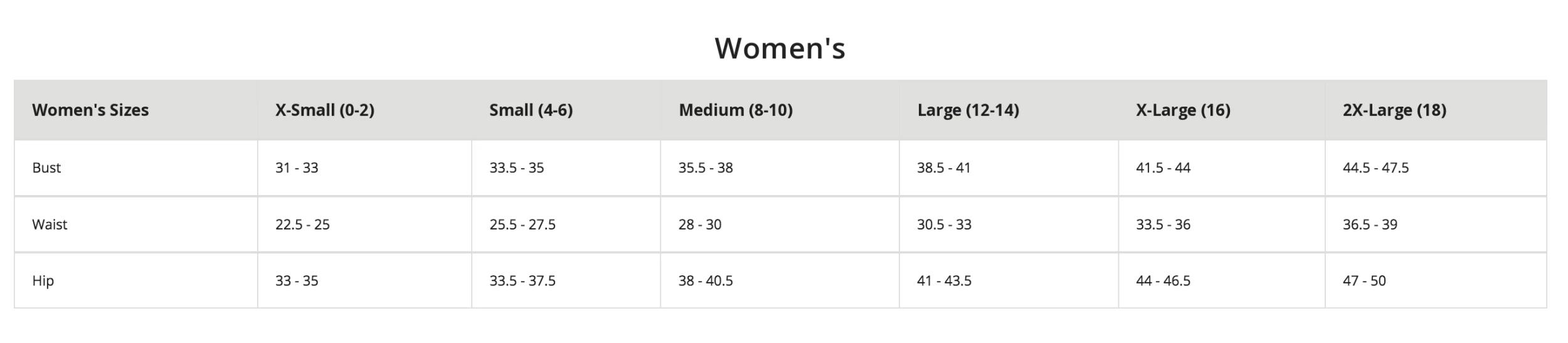 | Size | Women's XS, Women's SMALL, Women's MEDIUM, Women's LARGE, Women's XL |