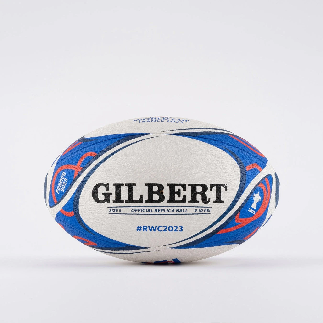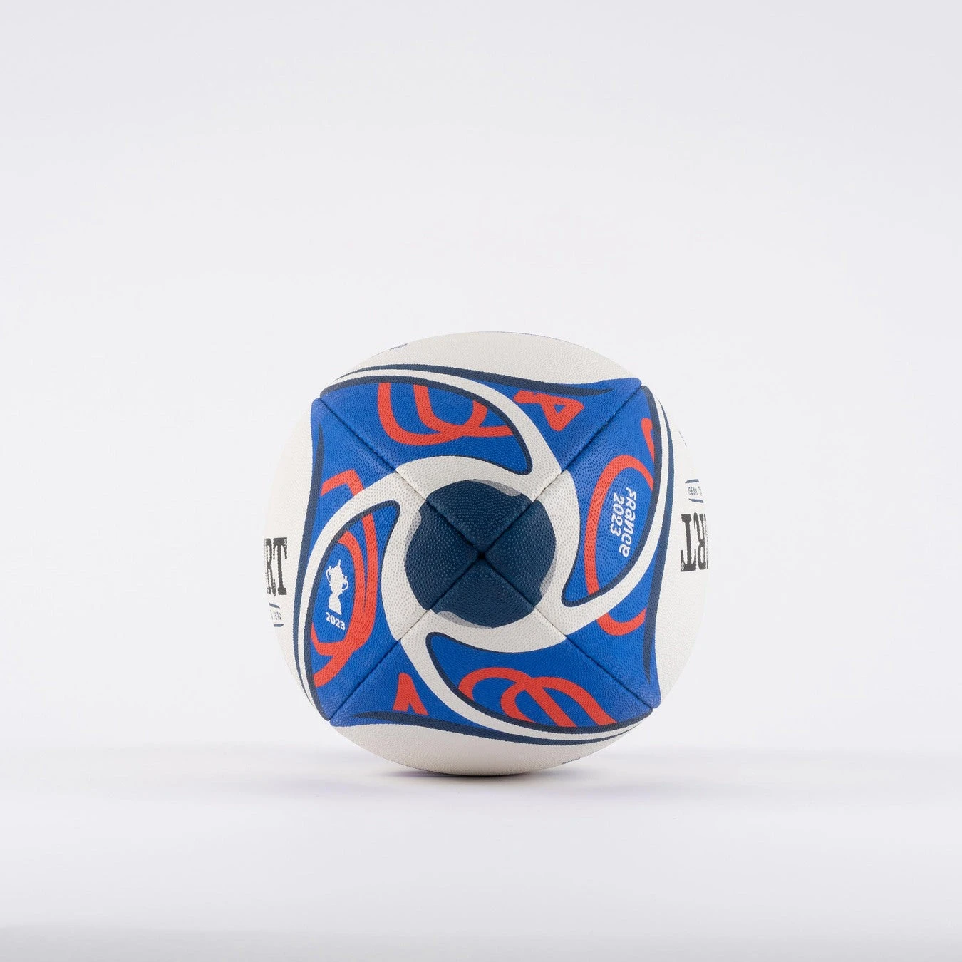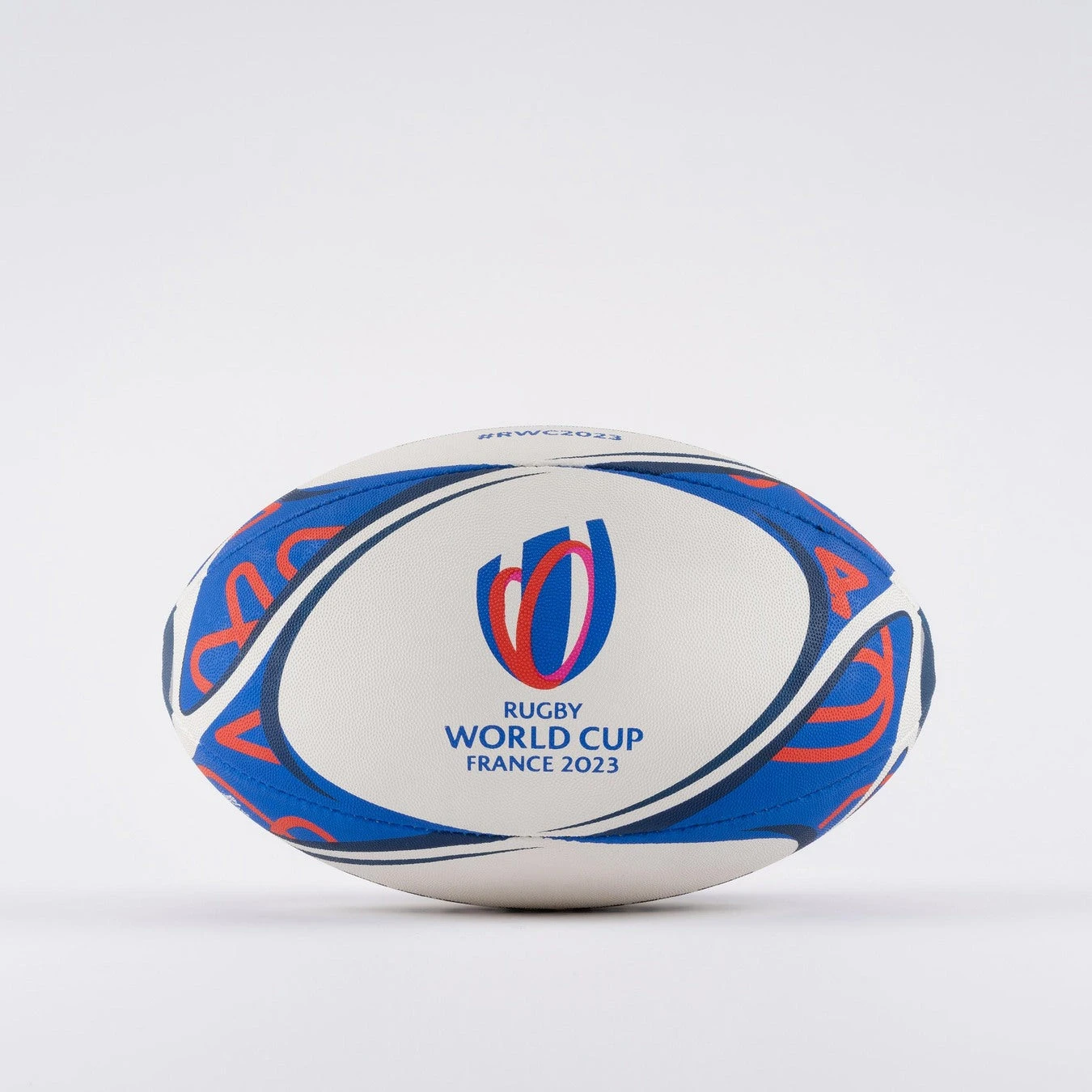 The striking design includes the official colours designed by tournament organisers France 2023, with the official event mark and official tournament hashtag #RWC2023 included on 2 panels. As the finishing touch, also included is the iconic RWC Webb Ellis trophy icon on either end of the ball.
