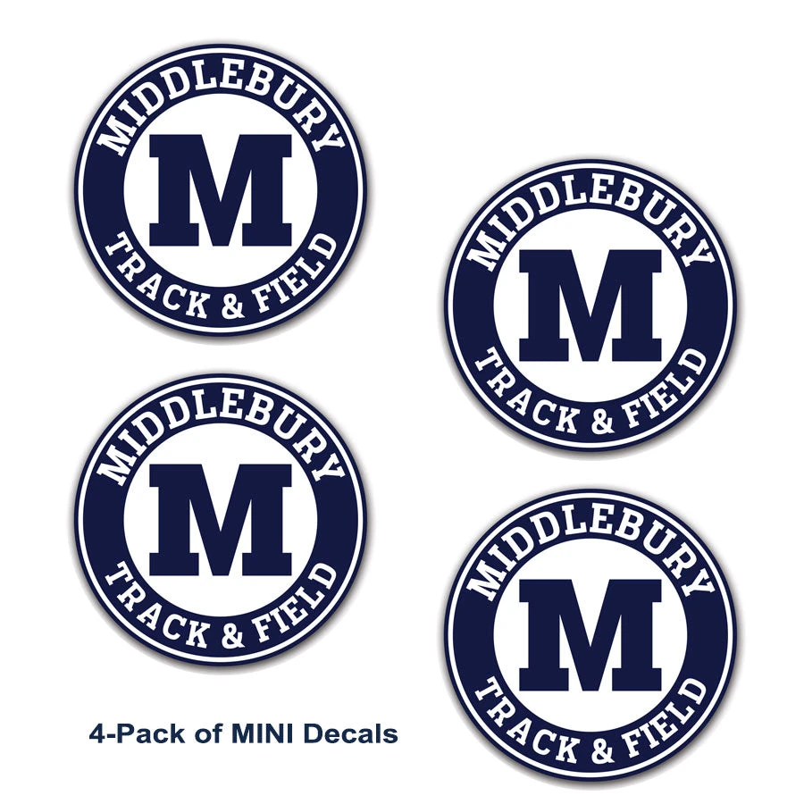 Middlebury Track & Field Decals. Stickers will last for years in all weather elements and will stick to virtually anything with a smooth surface.